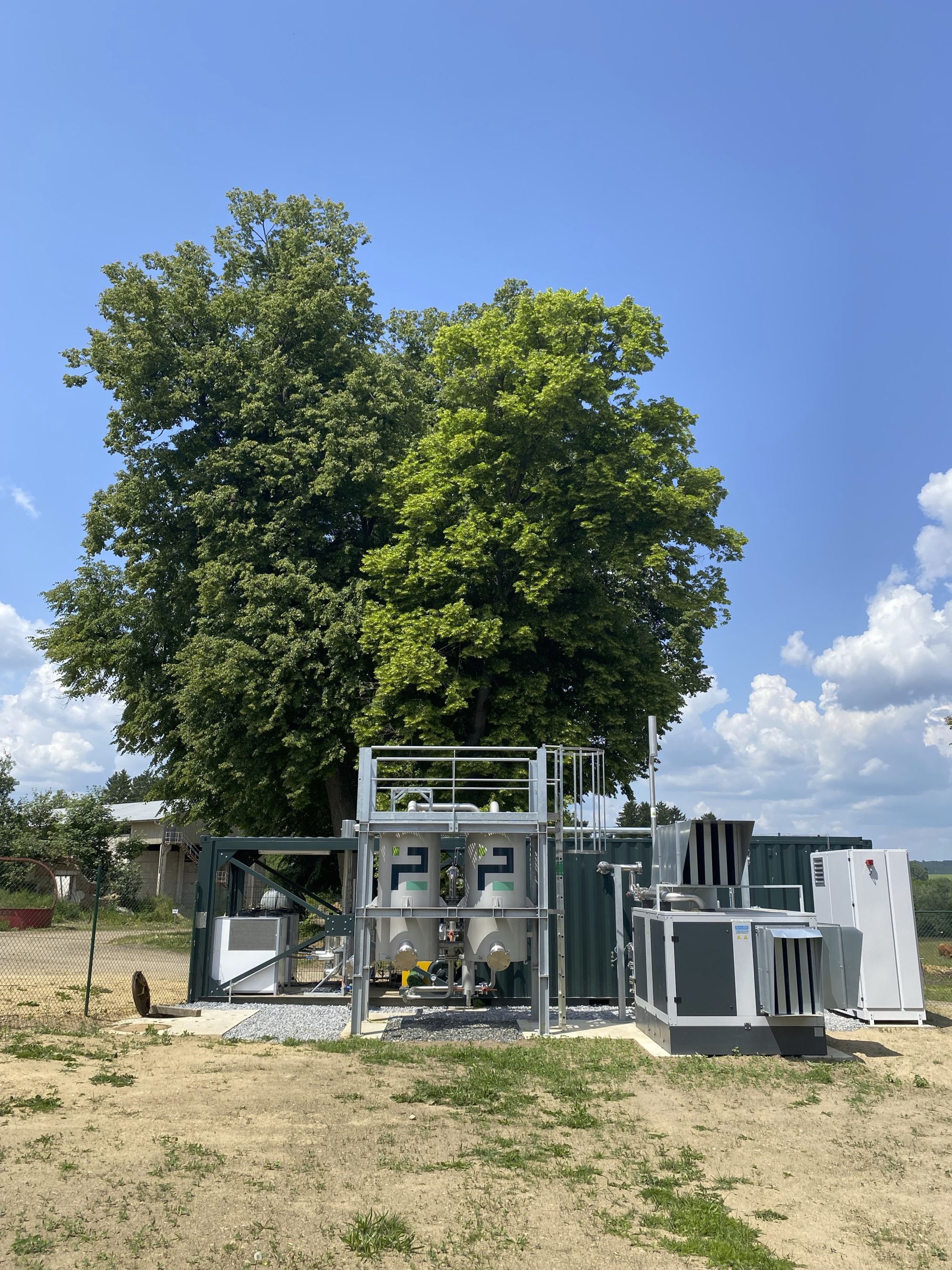 Herálec près de Humpolec. À première vue, le site biogaz ressemble à des dizaines d'autres fermes. Dans la première phase du processus, la biomasse (composée notamment du fumier de vaches provenant de la ferme locale) est acheminée vers le site de méthanisation et d'épuration du biogaz, qui est exploité conjointement avec la ferme par la société d’investissement SUR LIE. La différence réside dans la dernière étape de la production : seule une partie du biogaz généré est utilisée pour produire de l’électricité. Près de la moitié du gaz vert est transformée en biométhane grâce à la technologie de PRODEVAL. Le cœur de cette technologie est une unité d'épuration membranaire. Des membranes polymères en forme de milliers de petites pailles, disposées dans le sens de la longueur dans un cylindre métallique, séparent les molécules de dioxyde de carbone et de méthane. À Herálec, cette unité est capable de traiter entre 105 et 210 Nm³ de biogaz par heure pour produire du biométhane avec une teneur en méthane supérieure à 95 %.